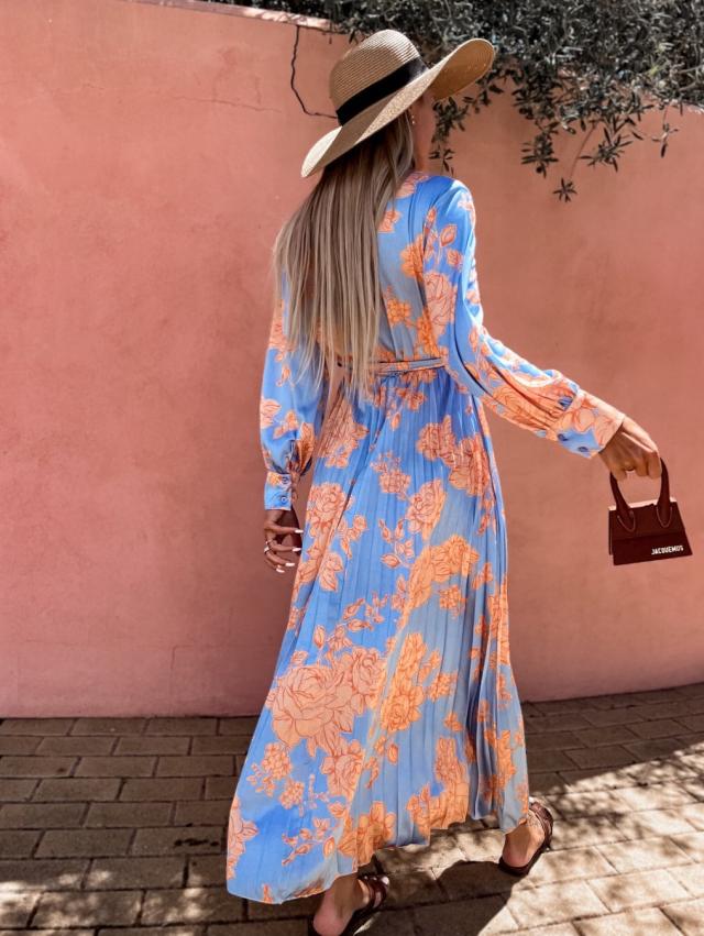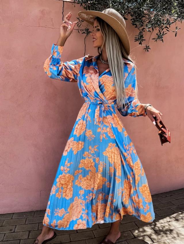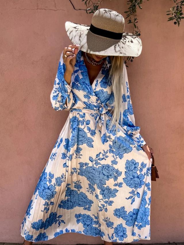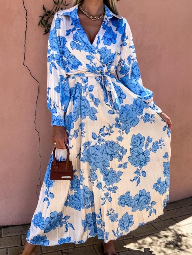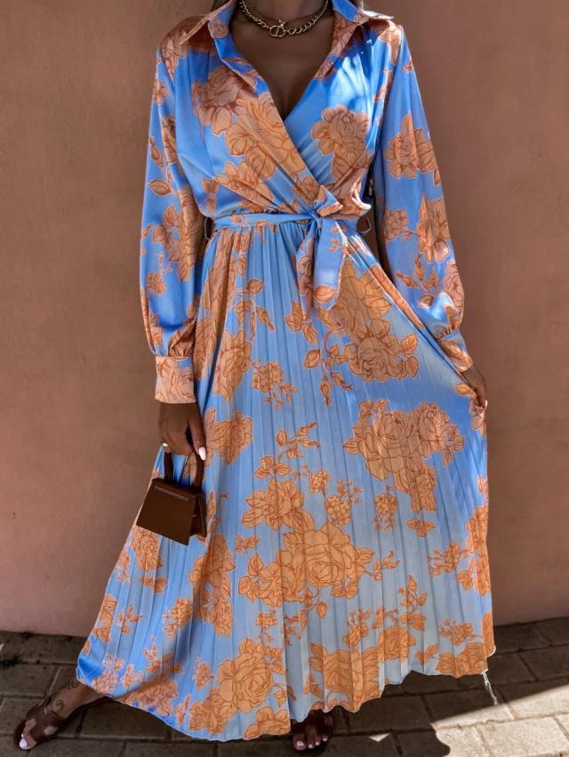 Product information: Fabric name: polyester Style: leisure Skirt length: long skirt Skirt type: large swing type Collar: V-neck Sleeve type: conventional sleeve Sleeve Length: Long Sleeve Waist type: mid-waist Clothes placket: pullover Color: blue, yellow