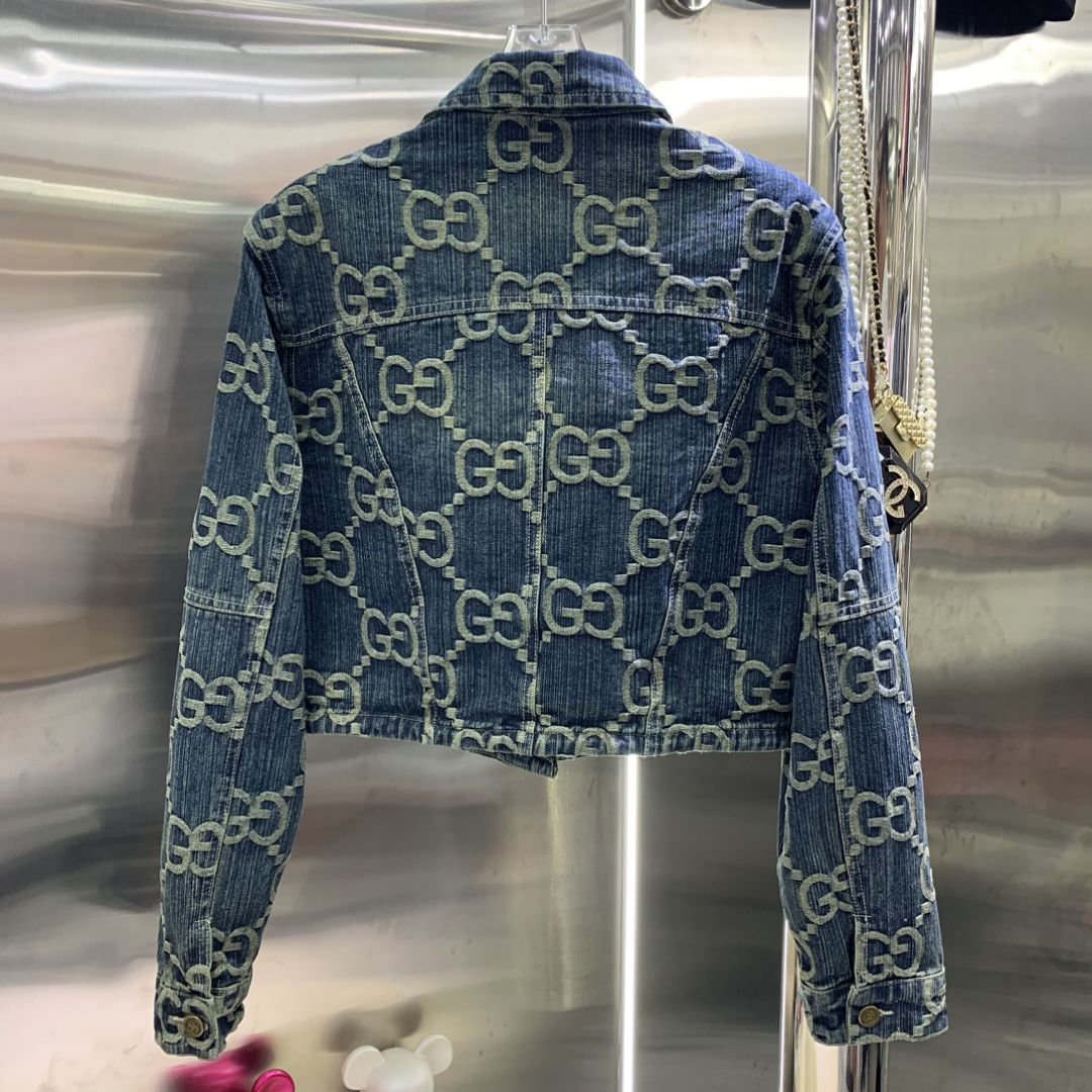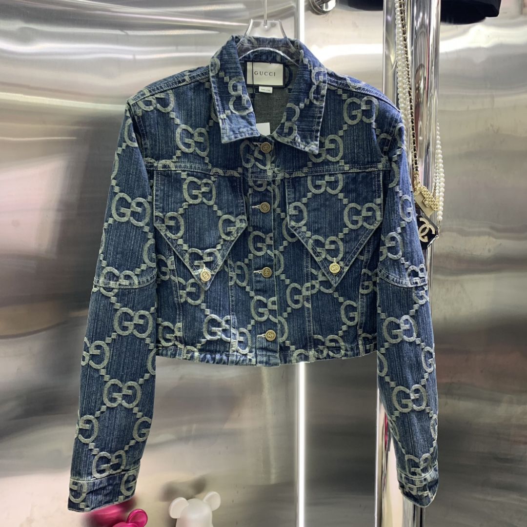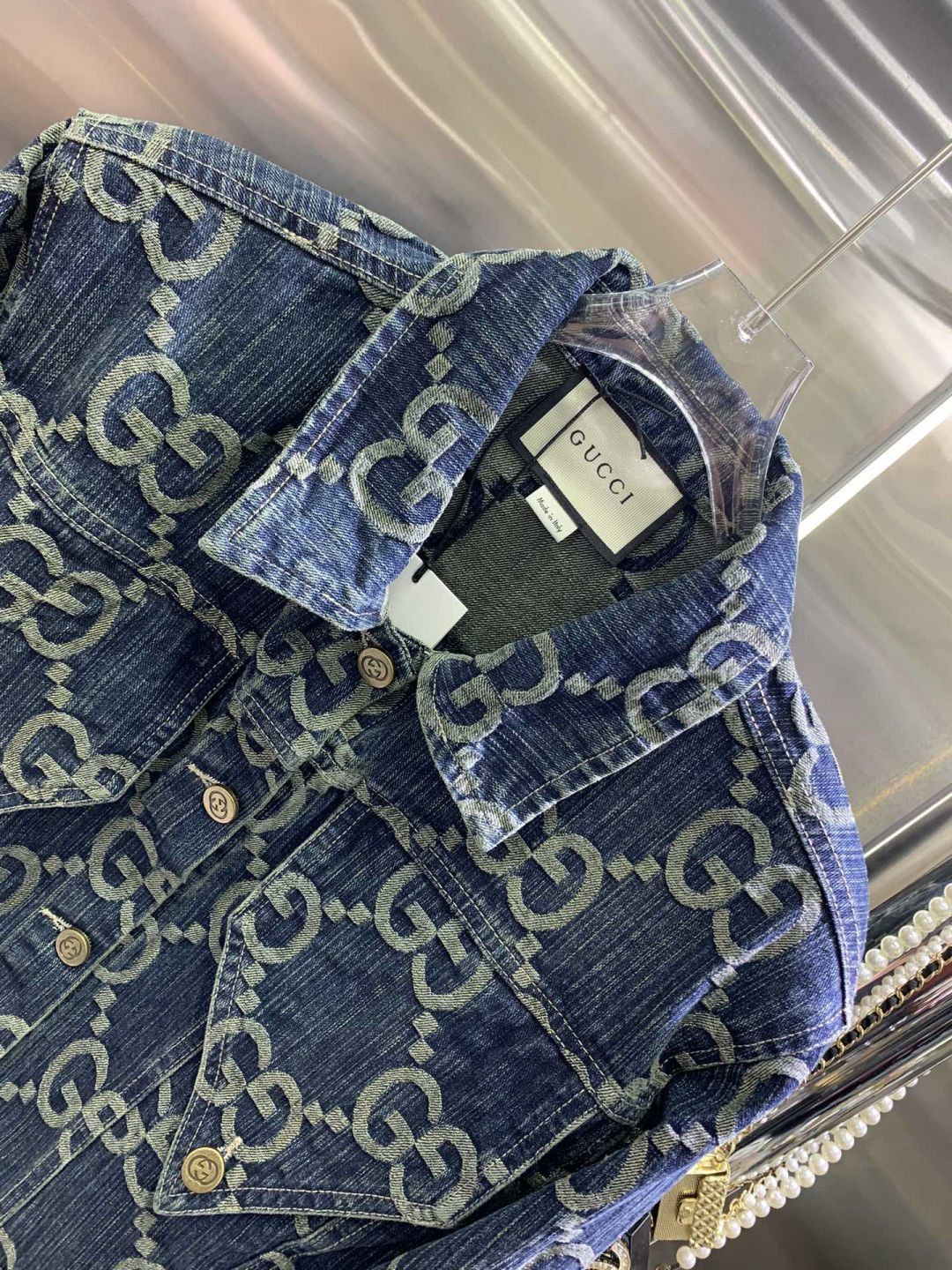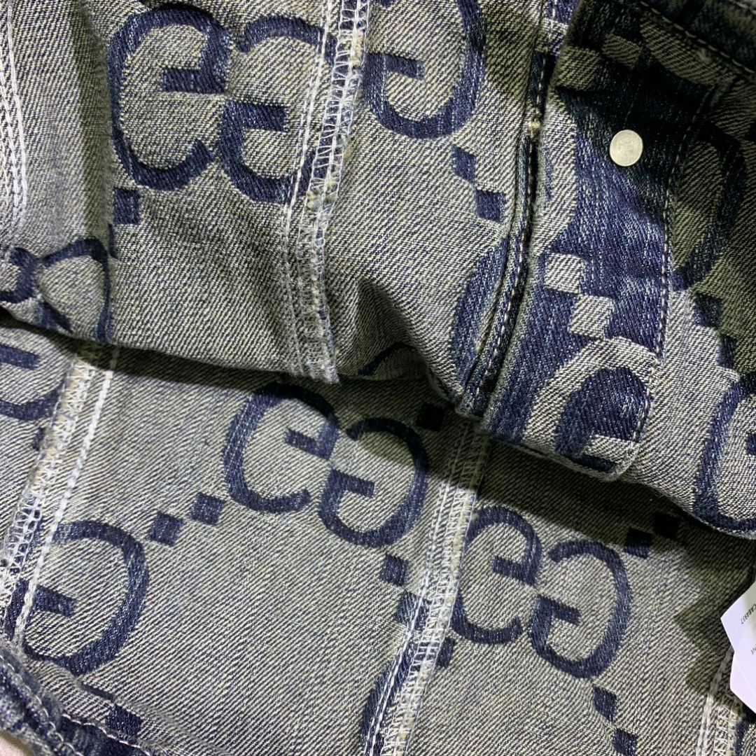 Gucci infuses the traditional denim jacket with its signature maximalism by incorporating the jumbo version of its signature 'GG' motif into this style. Meant to be worn with the matching jeans or shorts for the most impact, it's designed in a slightly loose silhouette with button-fastening flap pockets. Color: blue